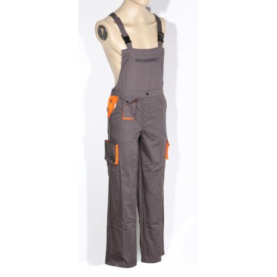 Φόρμα εργασίας με διχρωμία στις τιράντες και στα καπάκια στις τσέπες, με λειτουργικές τσέπες στο πλάι , πίσω και ψηλά στον μηρό καθώς και διπλή τσέπη στο στήθος μία ανοιχτή και μία με φερμουάρ.